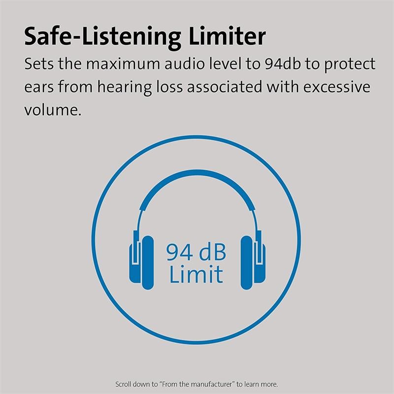 • El limitador de escucha segura establece el nivel de audio máximo en 94 db para proteger los oídos de la pérdida auditiva asociada a volúmenes muy altos.
