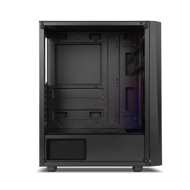 Semitorre con diseño gaming Nox Hummer Frost con tira frontal LED ARGB Rainbow, ventana lateral de cristal templado, capacidad hasta 6 ventiladores de 120 mm, principales puertos a mano y compatible con gráficas de gran tamaño.