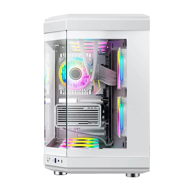¡Descubre el PC Gaming Hype, la cima del gaming en blanco y negro! Con diseño panorámico en vidrio templado, tres ventiladores Infinity ARGB Dual-Ring para óptima refrigeración, y capacidad para configuraciones de alta gama. ¡Hazte con lo mejor para tu experiencia gaming!
